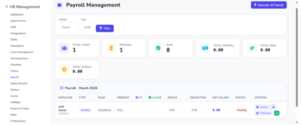 Generate salaries, manage deductions, bonuses, and automate payroll processes effortlessly.